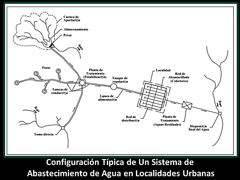 Se muestra la configuración típica de un sistema de abastecimiento de agua en localidades urbanas. Es importante mencionar que una vez que el agua ha sido empleada, debe ser desalojada a través de una red de alcantarillado y conducida a una planta de tratamiento para que posteriormente pueda ser reutilizada o reintegrada a la naturaleza sin causar deterioro ambiental.